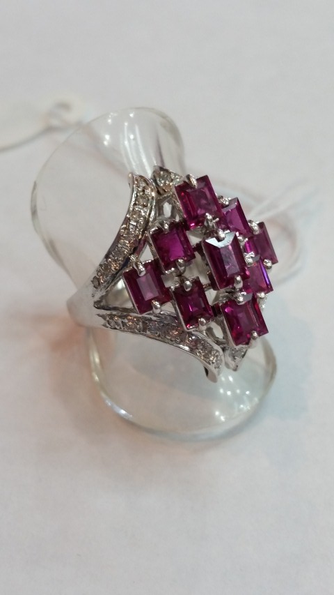 טבעת בסגנון וינטג' בזהב לבן 14 קראט משובצת ביהלומים איכותיים 9 אבני חן רובי מרובעות בצורת מעוין נדירה ומרשימה ביופייה למביני עניין משקל6.6 גרם