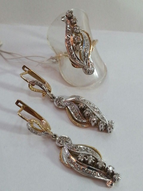 סט וינטג' בזהב צהוב 18 קראט טבעת ועגילים משובץ ביהלומים מיוחד ביופיו